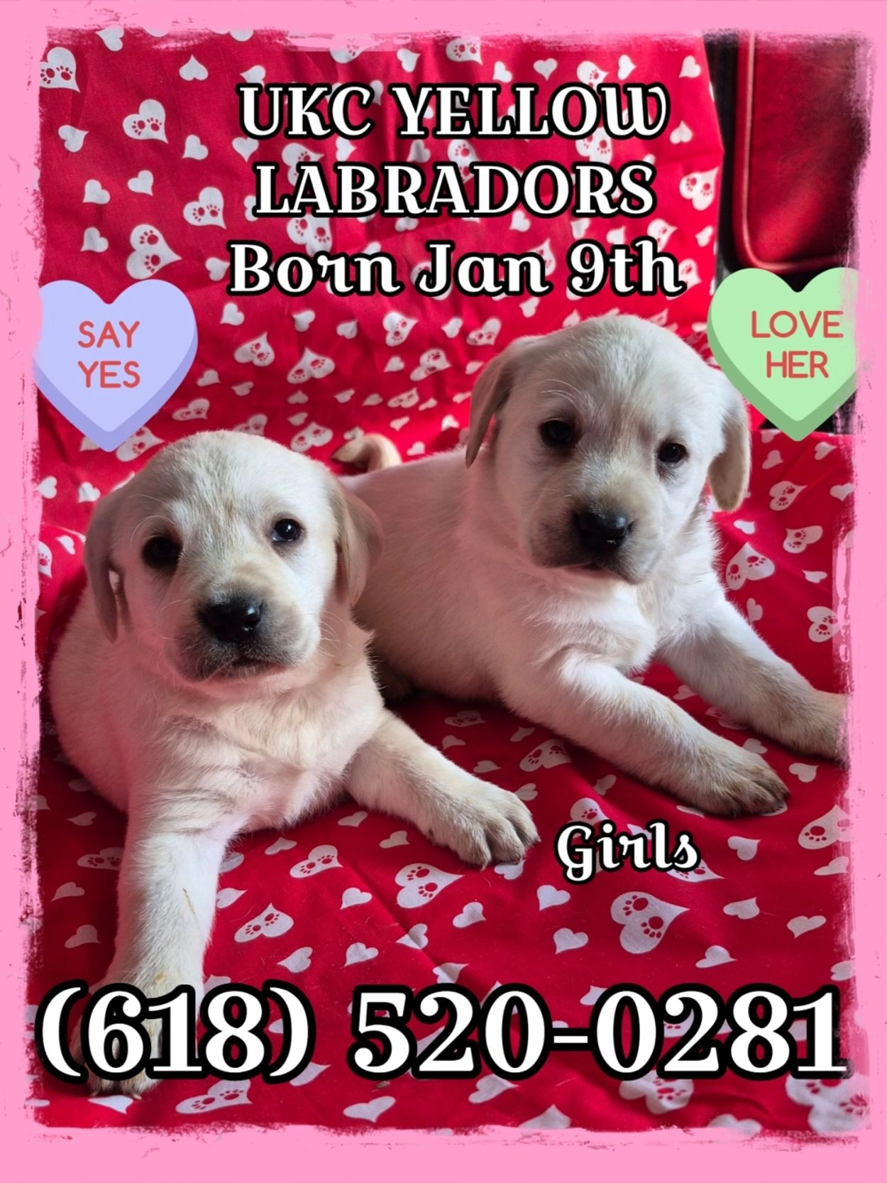 Yellow lab girls-Born Jan 9th now accepting deposits to reserve pick. Ask Gina how you can reserve your pick.